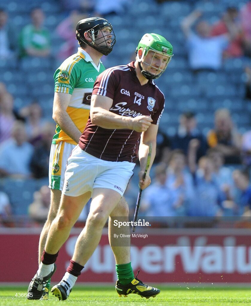 20 June 2010; Joe Canning, Galway, celebrates after scoring a second half goal as Paul Cleary, Offaly, watches on. Leinster GAA Hurling Senior Championship Semi-Final, Galway v Offaly, Croke Park, Dublin. Picture credit: Oliver McVeigh / SPORTSFILE