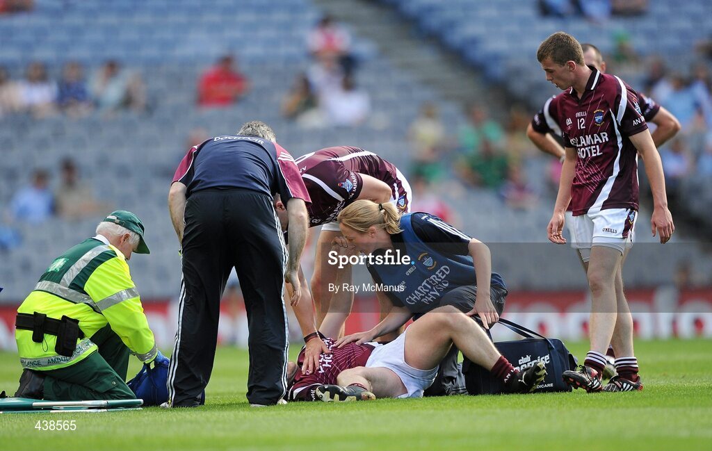 27 June 2010; Westmeath's Derek Heavin is attended to by the team's Chartered Physiotherapist and a member of The St. John Ambulance Brigade of Ireland after suffering a suspected dislocated knee during the game. Leinster GAA Football Senior Championship Semi-Final, Westmeath v Louth, Croke Park, Dublin. Picture credit: Ray McManus / SPORTSFILE
