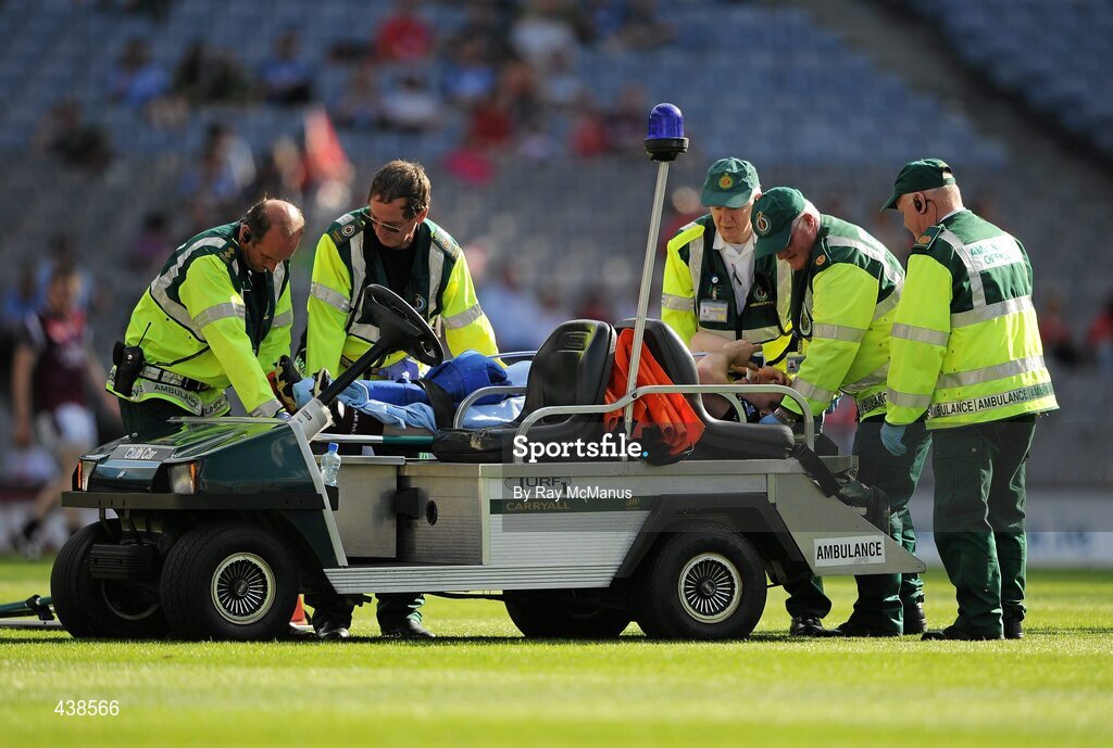 27 June 2010; Westmeath's Derek Heavin is attended to by members of The St. John Ambulance Brigade of Ireland after suffering a suspected dislocated knee during the game. Leinster GAA Football Senior Championship Semi-Final, Westmeath v Louth, Croke Park, Dublin. Picture credit: Ray McManus / SPORTSFILE