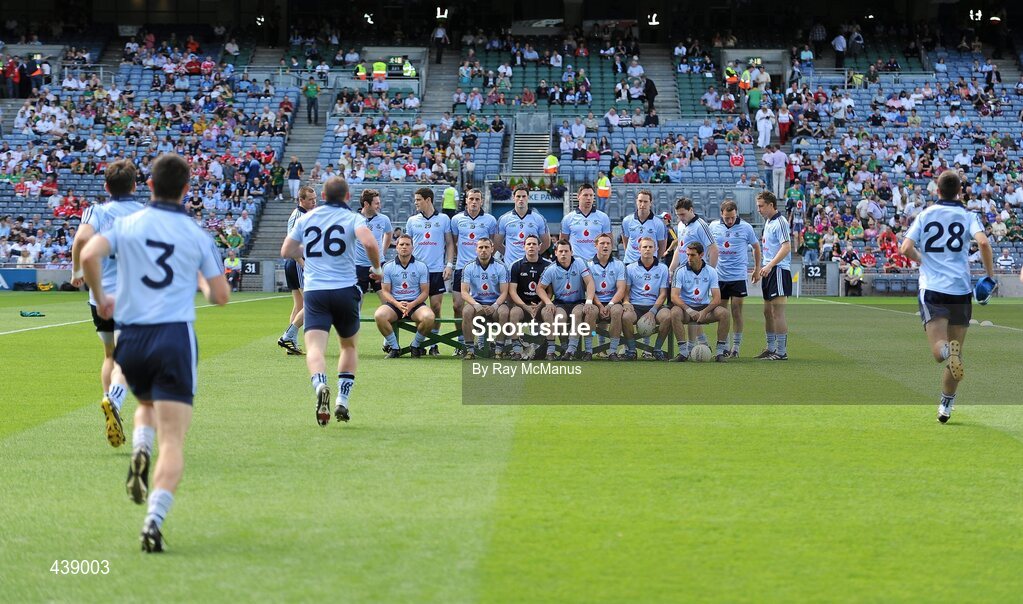 27 June 2010; James McCarthy, 28, Pat Burke, 26, and Rory O'Carroll the Dublin full-back join their team-mates in the team photograph. Leinster GAA Football Senior Championship Semi-Final, Meath v Dublin, Croke Park, Dublin. Picture credit: Ray McManus / SPORTSFILE