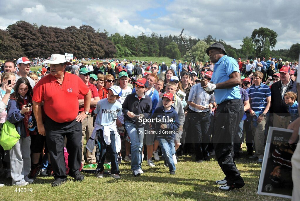 5 July 2010; Samuel L Jackson, along with supporters, watches his chip onto the 15th green during the JP McManus Invitational Pro-Am. Adare Manor, Adare, Co. Limerick. Picture credit: Diarmuid Greene / SPORTSFILE