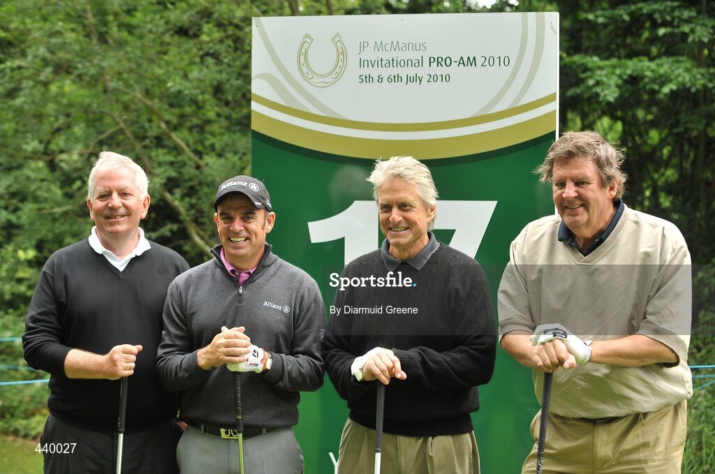 5 July 2010; The Dunhill Team consisting of, from left to right, Charlie McCreevy, Paul McGinley, Michael Douglas and Johann Rupert before teeing off at the 17th tee box at the JP McManus Invitational Pro-Am. Adare Manor, Adare, Co. Limerick. Picture credit: Diarmuid Greene / SPORTSFILE