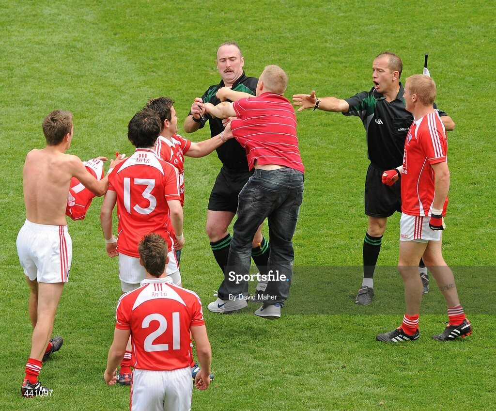 11 July 2010; A spectator approaches referee Martin Sludden at the end of the game. Leinster GAA Football Senior Championship Final, Meath v Louth, Croke Park, Dublin. Picture credit: David Maher / SPORTSFILE