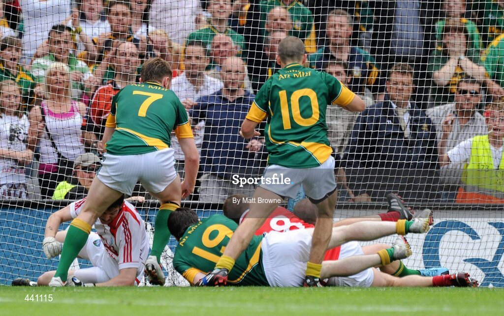11 July 2010; Joe Sheridan, Meath, is tackled on the ground by Louth goalkeeper Neil Gallagher and Paddy Keenan, 8, before scoring the winning goal against Louth. Leinster GAA Football Senior Championship Final, Meath v Louth, Croke Park, Dublin. Picture credit: Matt Browne / SPORTSFILE