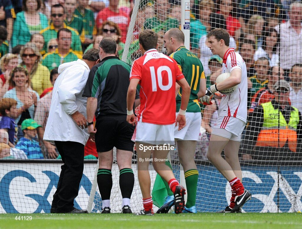 11 July 2010; Referee Martin Sludden goes to his umpire before awarding a goal to Meath. Leinster GAA Football Senior Championship Final, Meath v Louth, Croke Park, Dublin. Picture credit: Matt Browne / SPORTSFILE