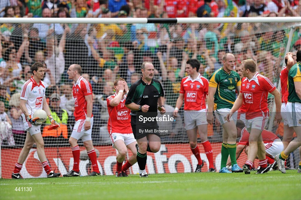 11 July 2010; Louth players react after referee Martin Sludden awarded a goal to Meath. Leinster GAA Football Senior Championship Final, Meath v Louth, Croke Park, Dublin. Picture credit: Matt Browne / SPORTSFILE