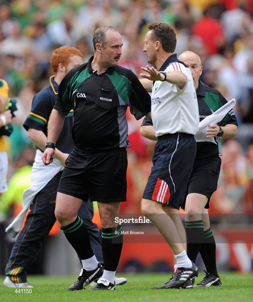 11 July 2010; Louth manager Peter Fitzpatrick with referee Martin Sludden after the final whistle. Leinster GAA Football Senior Championship Final, Meath v Louth, Croke Park, Dublin. Picture credit: Matt Browne / SPORTSFILE