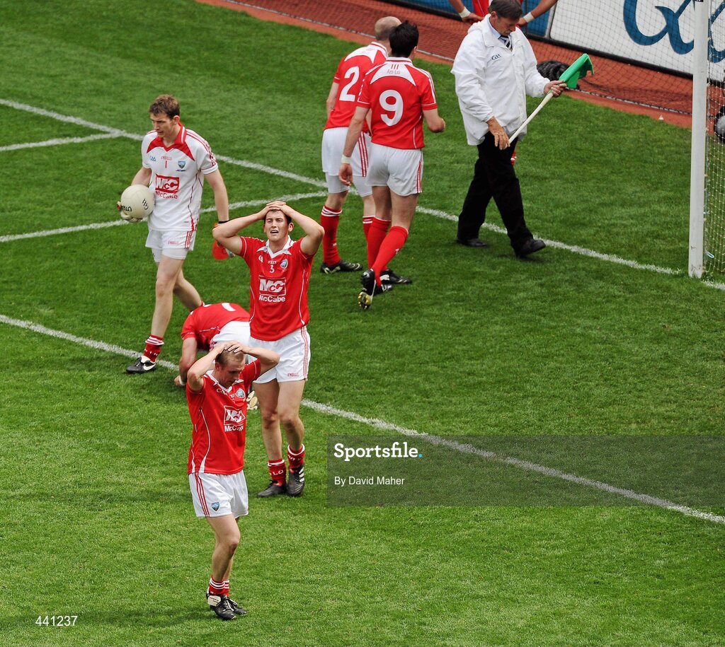 11 July 2010; Disappointed Louth players, Ray Finnegan, foreground, 3, Dessie Finnegan and goalkeeper Neil Gallagher, as Eamonn McAuley, 2, and Brian While, 9, confront the umpire after Joe Sheridan, Meath, had scored a late goal. Leinster GAA Football Senior Championship Final, Meath v Louth, Croke Park, Dublin. Picture credit: David Maher / SPORTSFILE