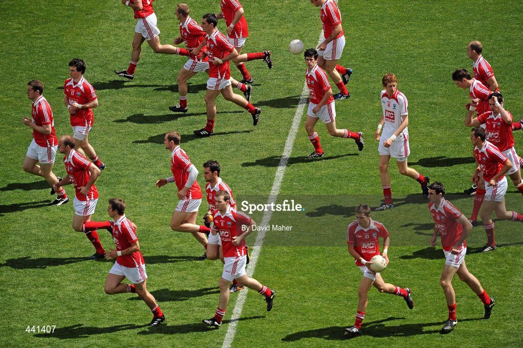 11 July 2010; Louth players run to their places after the traditional team photograph. Leinster GAA Football Senior Championship Final, Meath v Louth, Croke Park, Dublin. Picture credit: David Maher / SPORTSFILE