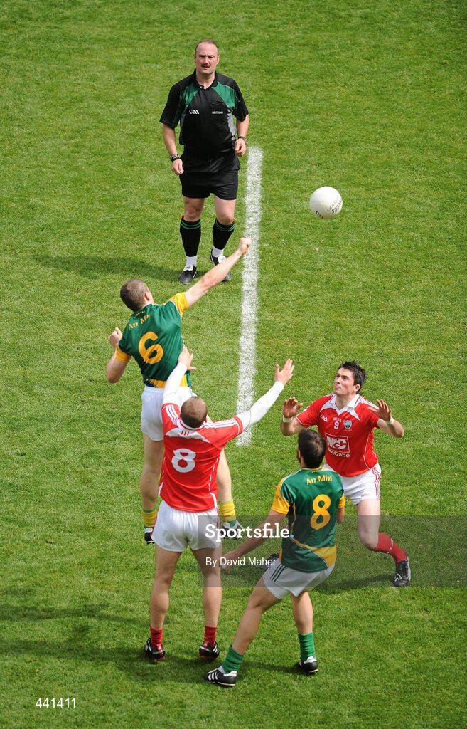 11 July 2010; Referee Martin Sludden throws the ball in between Meath's Nigel Crawford, 6, and Brian Meade, 8, and Louth's Paddy Keenan, 8, and Brian White, 9, for the start of the second half. Leinster GAA Football Senior Championship Final, Meath v Louth, Croke Park, Dublin. Picture credit: David Maher / SPORTSFILE