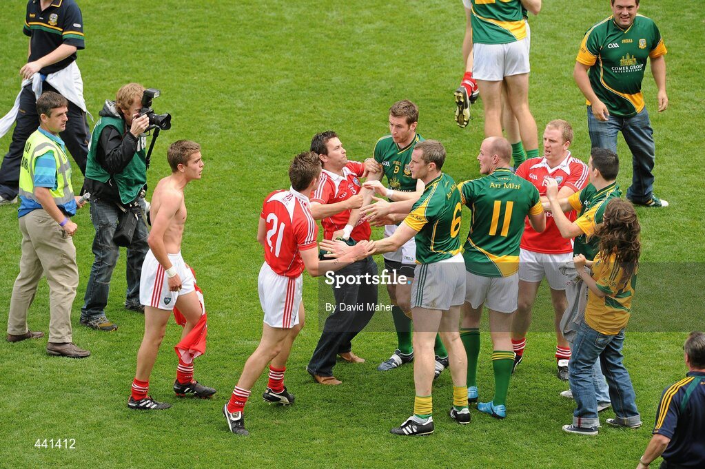 11 July 2010; Players and supporters from both Meath and Louth confront each other at the end of the game. Leinster GAA Football Senior Championship Final, Meath v Louth, Croke Park, Dublin. Picture credit: David Maher / SPORTSFILE