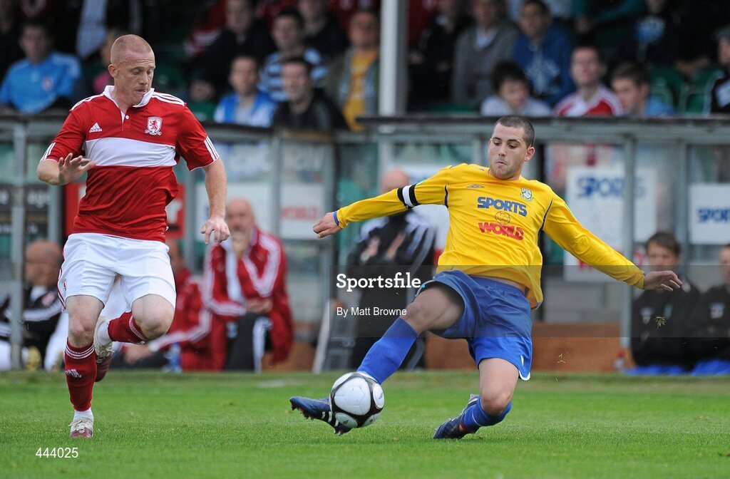 21 July 2010; Dave Webster, Bray Wanderers, in action against Nik Bailey, Middlesbrough. Pre-season Friendly, Bray Wanderers v Middlesbrough, Carlisle Grounds, Bray, Co. Wicklow. Picture credit: Matt Browne / SPORTSFILE
