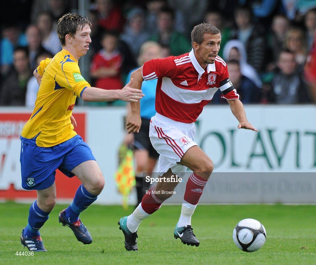 21 July 2010; Gary O'Neil, Middlesbrough, in action against James Kavanagh, Bray Wanderers. Pre-season Friendly, Bray Wanderers v Middlesbrough, Carlisle Grounds, Bray, Co. Wicklow. Picture credit: Matt Browne / SPORTSFILE