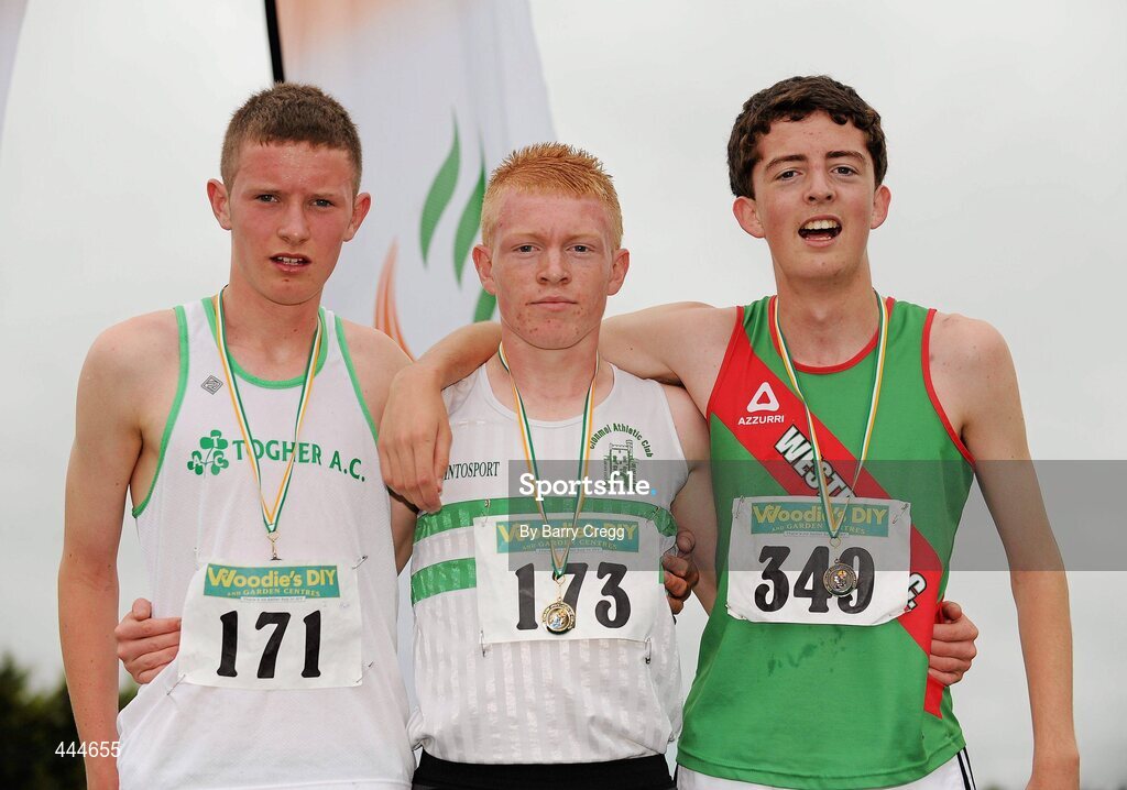 24 July 2010; Sean Tobin, Clonmel, winner of the U-17 Boy's 1500m alongside Ian Hartnett, Togher, left, and Anthony Chambers, Westport, at the Woodie's DIY Juvenile Track and Field Championships. Tullamore Harriers Stadium, Tullamore, Co. Offaly. Picture credit: Barry Cregg / SPORTSFILE