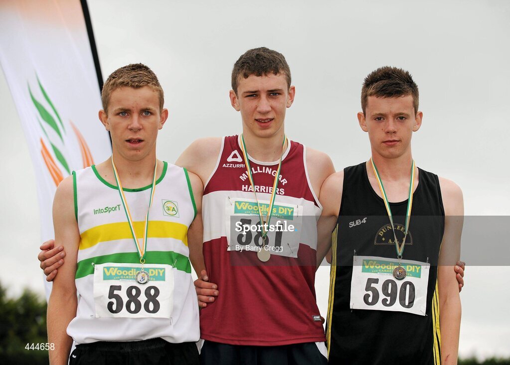 24 July 2010; Robert Yorke, Mullingar Harriers, winner of the U-18 Boy's 1500m alongside Stephen Attride, St. Abbans, left and Carl Dunne, Dunleer at the Woodie's DIY Juvenile Track and Field Championships. Tullamore Harriers Stadium, Tullamore, Co. Offaly. Picture credit: Barry Cregg / SPORTSFILE