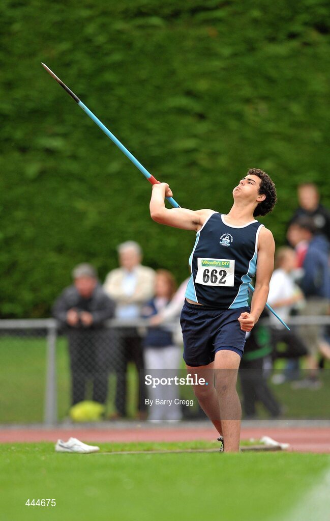 24 July 2010; James Sloan, Dromore High School, in action during the U-17 Boy's Javelin at the Woodie's DIY Juvenile Track and Field Championships. Tullamore Harriers Stadium, Tullamore, Co. Offaly. Picture credit: Barry Cregg / SPORTSFILE