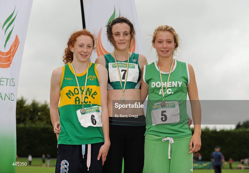 24 July 2010; Aisling Quinn, Ferrybank, winner of the U-14 Girl's 1500m alongside Ciara Cummins, Moyne, left, and Bella Sherlock, Doheny, during the Woodie's DIY Juvenile Track and Field Championships. Tullamore Harriers Stadium, Tullamore, Co. Offaly. Picture credit: Barry Cregg / SPORTSFILE