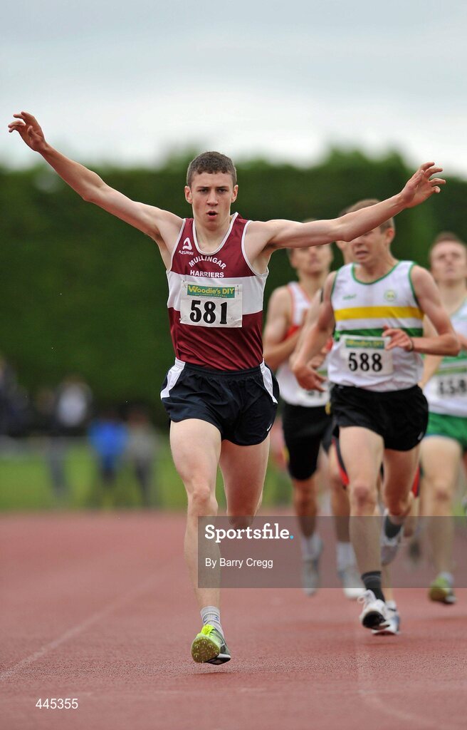 24 July 2010; Robert Yorke, Mullingar Harriers, wins the U-18 Boy's 1500m ahead of Stephen Attride, St. Abbans, at the Woodie's DIY Juvenile Track and Field Championships. Tullamore Harriers Stadium, Tullamore, Co. Offaly. Picture credit: Barry Cregg / SPORTSFILE