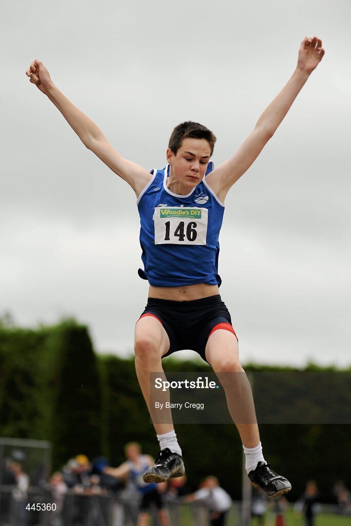24 July 2010; Daniel Pierce, Tralee Harriers, in action during the U-16 Boy's Triple Jump at the Woodie's DIY Juvenile Track and Field Championships. Tullamore Harriers Stadium, Tullamore, Co. Offaly. Picture credit: Barry Cregg / SPORTSFILE