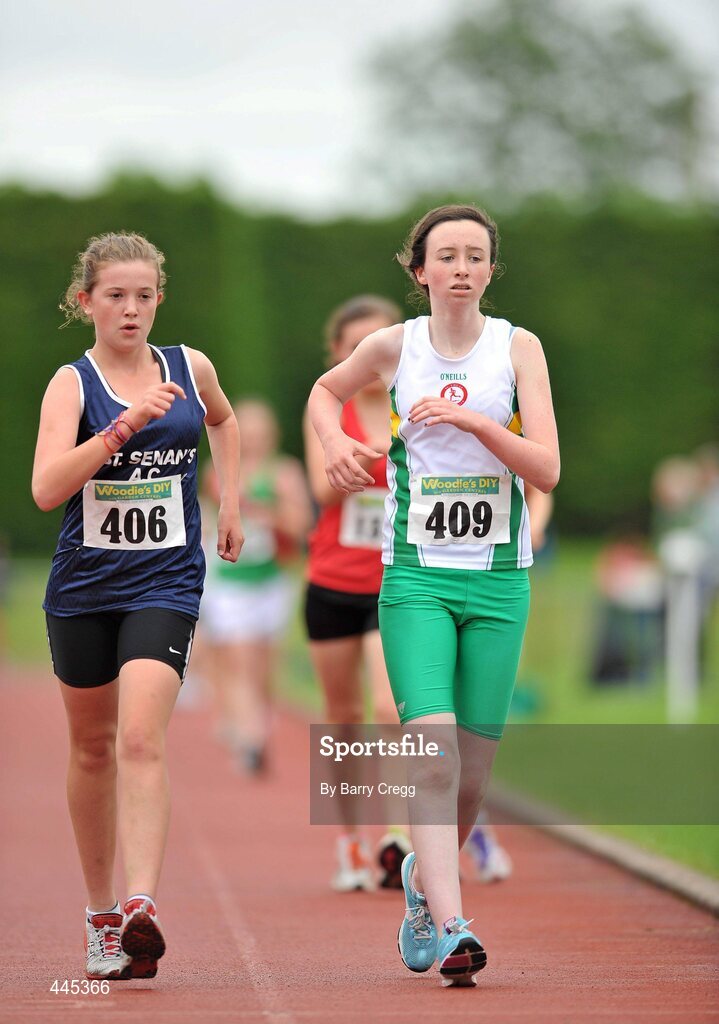 24 July 2010; Karen Burke, St. Coca's, right, ahead of Tara Lacey, St. Senans, during the U-14 Girls 2000m walk, at the Woodie's DIY Juvenile Track and Field Championships. Tullamore Harriers Stadium, Tullamore, Co. Offaly. Picture credit: Barry Cregg / SPORTSFILE