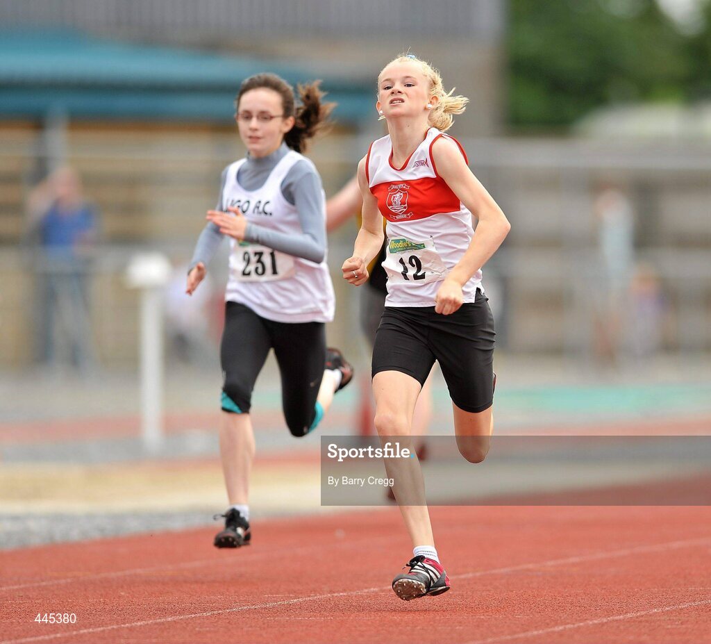 24 July 2010; Laura Ann Costello, Galway City Harriers, wins the U-14 Girl's 200m race ahead of Stacey Kerr, Sligo, at the Woodie's DIY Juvenile Track and Field Championships. Tullamore Harriers Stadium, Tullamore, Co. Offaly. Picture credit: Barry Cregg / SPORTSFILE