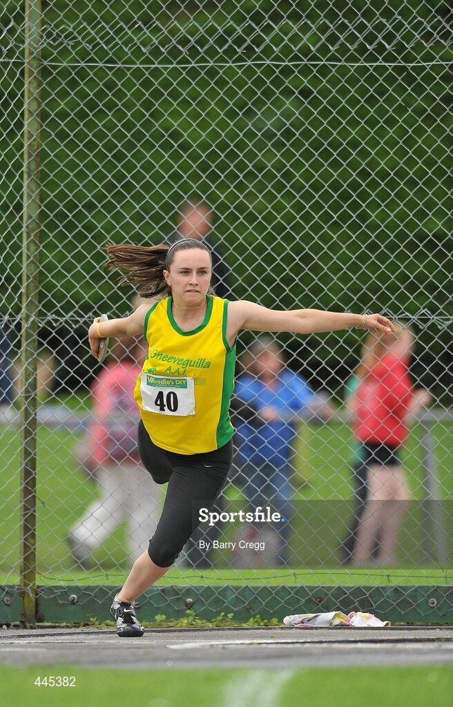 24 July 2010; Hannah O' Sullivan, Gneeveguilla, in action during the U-16 Girl's Discus at the Woodie's DIY Juvenile Track and Field Championships. Tullamore Harriers Stadium, Tullamore, Co. Offaly. Picture credit: Barry Cregg / SPORTSFILE