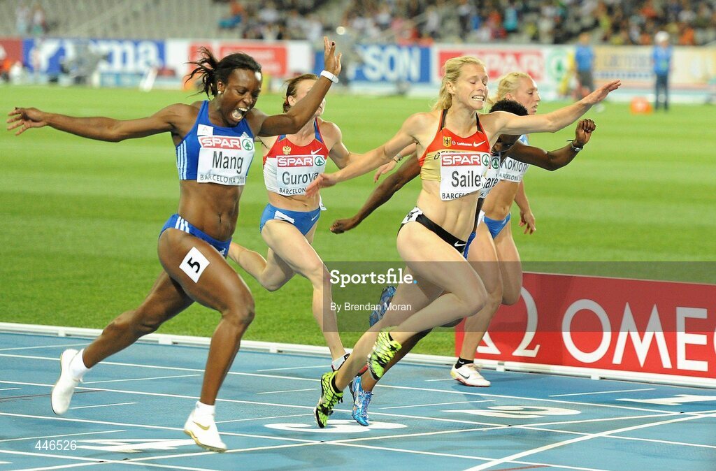 29 July 2010; Verena Sailer, centre, of Germany wins the Women's 100m Final from second placed Veronique Mang, left, and third placed Myriam Soumare, both of France. 20th European Athletics Championships Montjuïc Olympic Stadium, Barcelona, Spain. Picture credit: Brendan Moran / SPORTSFILE