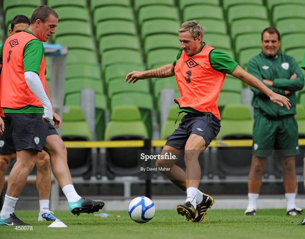 10 August 2010; Republic of Ireland's Liam Lawrence in action against his team-mate Richard Dunne during squad training ahead of their international friendly against Argentina on Wednesday. Republic of Ireland squad training, Aviva Stadium, Lansdowne Road, Dublin. Picture credit: David Maher / SPORTSFILE