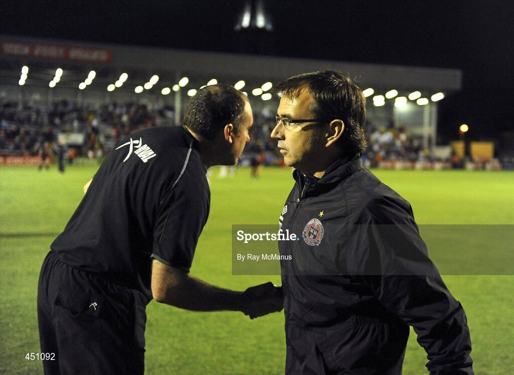 13 August 2010; Bohemaians manager Pat Fenlon, right, and Galway United manager Sean Connor shake hands after the game. Airtricity League Premier Division, Bohemians v Galway United, Dalymount Park, Dublin. Picture credit: Ray McManus / SPORTSFILE
