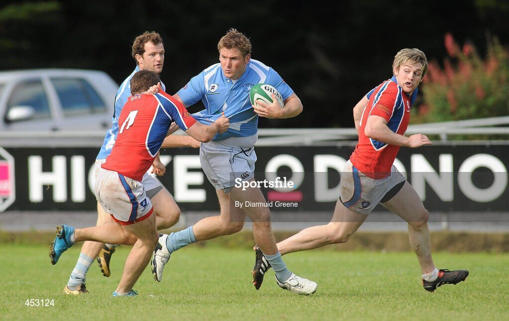 21 August 2010; Paul Neville, Garryowen, is tackled by Cian Aherne, left, and Darren Moroney, UL Bohemians. Mens Senior Final, 2010 Meteor Munster Rugby Sevens, Garryowen Rugby Club, Dooradoyle, Limerick. Picture credit: Diarmuid Greene / SPORTSFILE