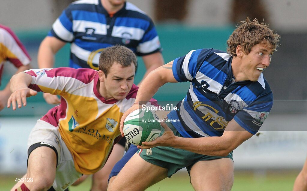 21 August 2010; Andy Brace, Old Crescent, is tackled by Mikey Carroll, Bruff. Mens Senior Plate Final, 2010 Meteor Munster Rugby Sevens, Garryowen Rugby Club, Dooradoyle, Limerick. Picture credit: Diarmuid Greene / SPORTSFILE