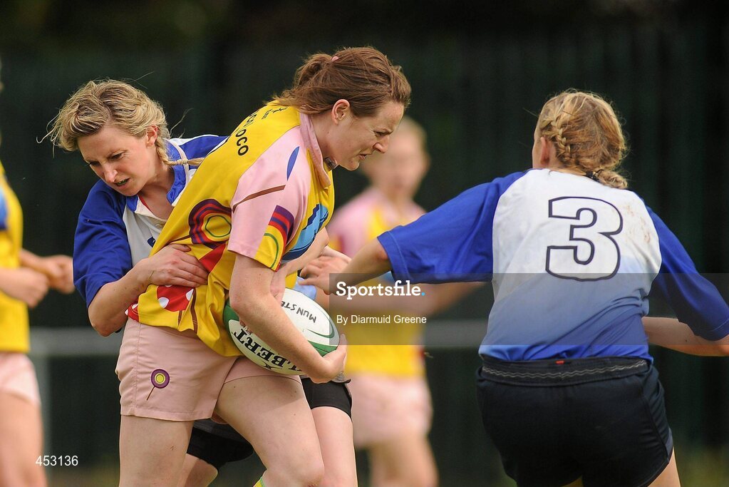 21 August 2010; Niamh English, Highfield, in action against Siobah Fleming, left, and Niamh Dempsey, Tralee. Womens Senior Cup Final, 2010 Meteor Munster Rugby Sevens, Garryowen Rugby Club, Dooradoyle, Limerick. Picture credit: Diarmuid Greene / SPORTSFILE