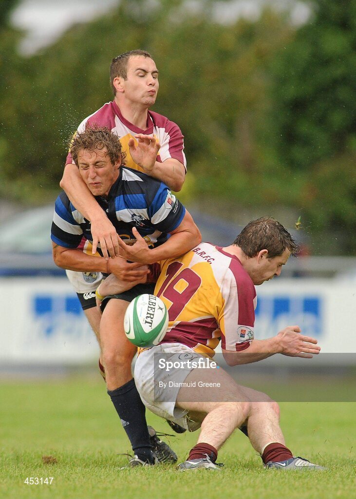 21 August 2010; Andy Brace, Old Crescent, is tackled by Stephen Shine, left, and Brian Cahill, Bruff. Mens Senior Plate Final, 2010 Meteor Munster Rugby Sevens, Garryowen Rugby Club, Dooradoyle, Limerick. Picture credit: Diarmuid Greene / SPORTSFILE