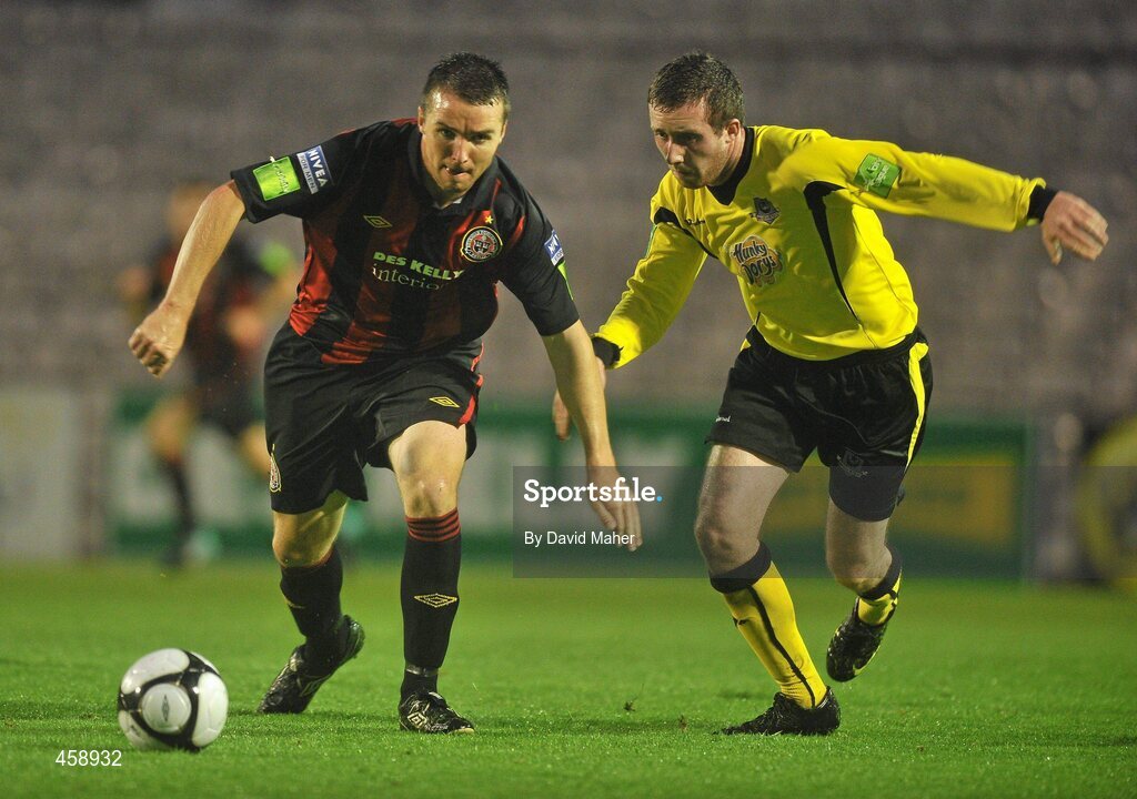 13 September 2010; Brian Shelley, Bohemians, in action against Ronan McEnteggart, Drogheda United. Airtricity League Premier Division, Bohemians v Drogheda United, Dalymount Park, Dublin. Picture credit: David Maher / SPORTSFILE