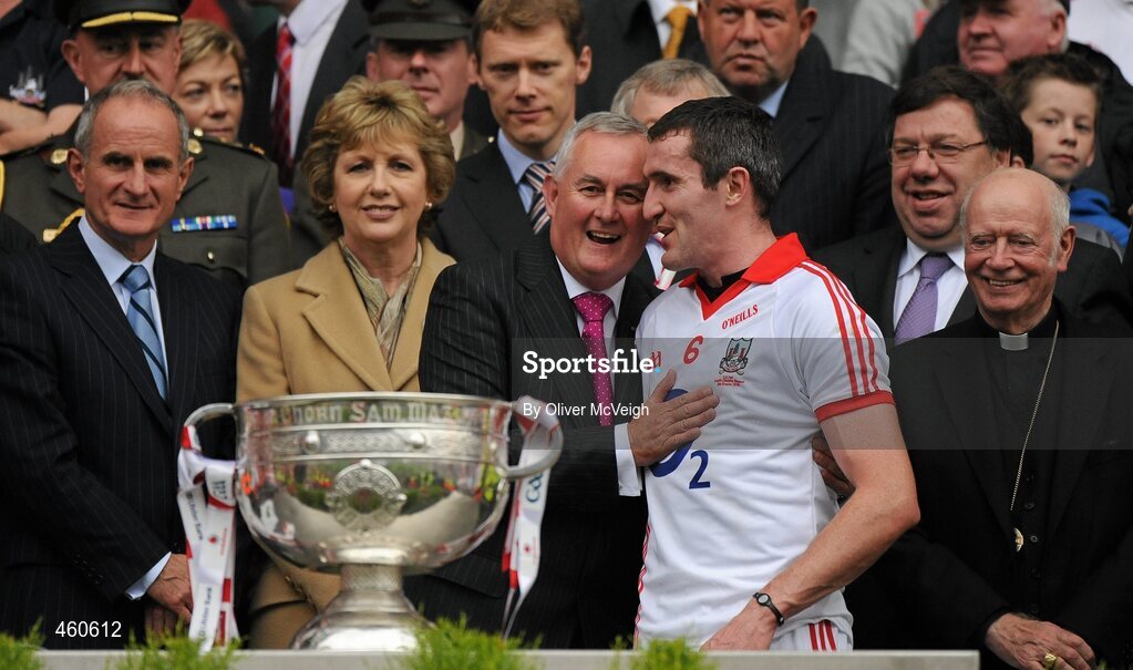 19 September 2010; Cork captain Graham Canty, is congratulated by fellow Cork man Uachtarán Chumann Lúthchleas Gael Criostóir Ó Cuana before presenting the Sam Maguire. GAA Football All-Ireland Senior Championship Final, Down v Cork, Croke Park, Dublin. Picture credit: Oliver McVeigh / SPORTSFILE