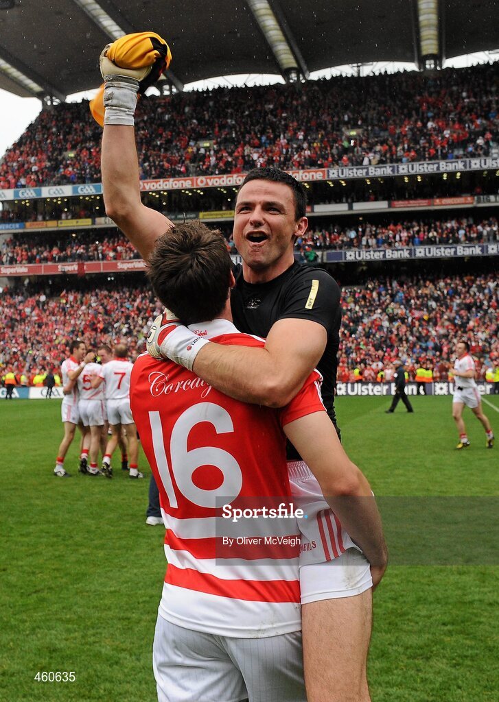 19 September 2010; Cork goalkeeper Alan Quirke celebrates with reserve goalkeeper Paddy O'Shea after the game. GAA Football All-Ireland Senior Championship Final, Down v Cork, Croke Park, Dublin. Picture credit: Oliver McVeigh / SPORTSFILE