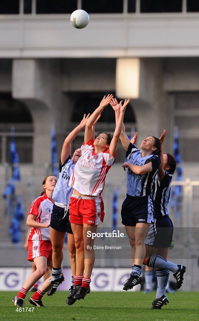 26 September 2010; Denise Masterson, right, and Siobhán McGrath, Dublin, contest a high ball with Sarah Donnelly, Tyrone. TG4 All-Ireland Senior Ladies Football Championship Final, Dublin v Tyrone, Croke Park, Dublin. Picture credit: Dáire Brennan / SPORTSFILE