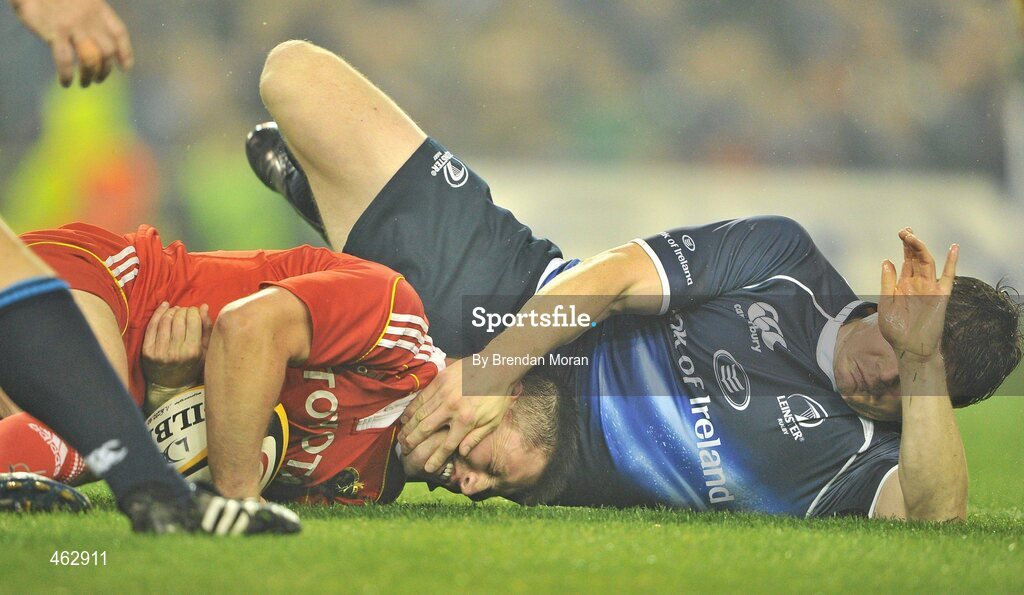 2 October 2010; Ronan O'Gara, Munster, is tackled by Brian O'Driscoll, Leinster. Celtic League, Leinster v Munster, Aviva Stadium, Lansdowne Road, Dublin. Picture credit: Brendan Moran / SPORTSFILE