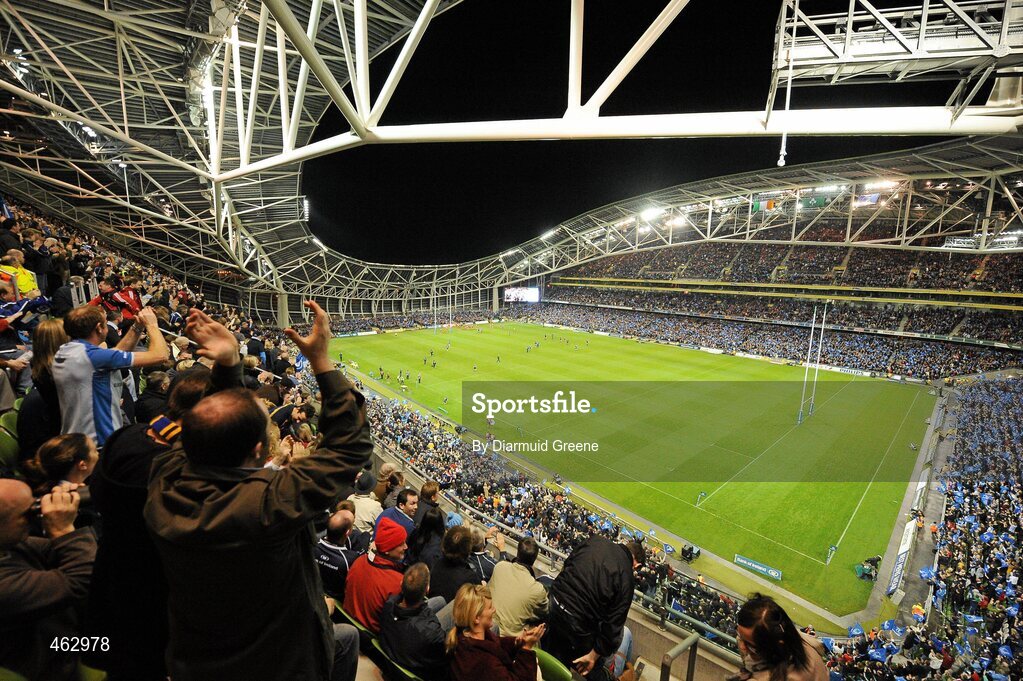 2 October 2010; Leinster supporters celebrate after Brian O'Driscoll scored his side's try. Celtic League, Leinster v Munster, Aviva Stadium, Lansdowne Road, Dublin. Picture credit: Diarmuid Greene / SPORTSFILE