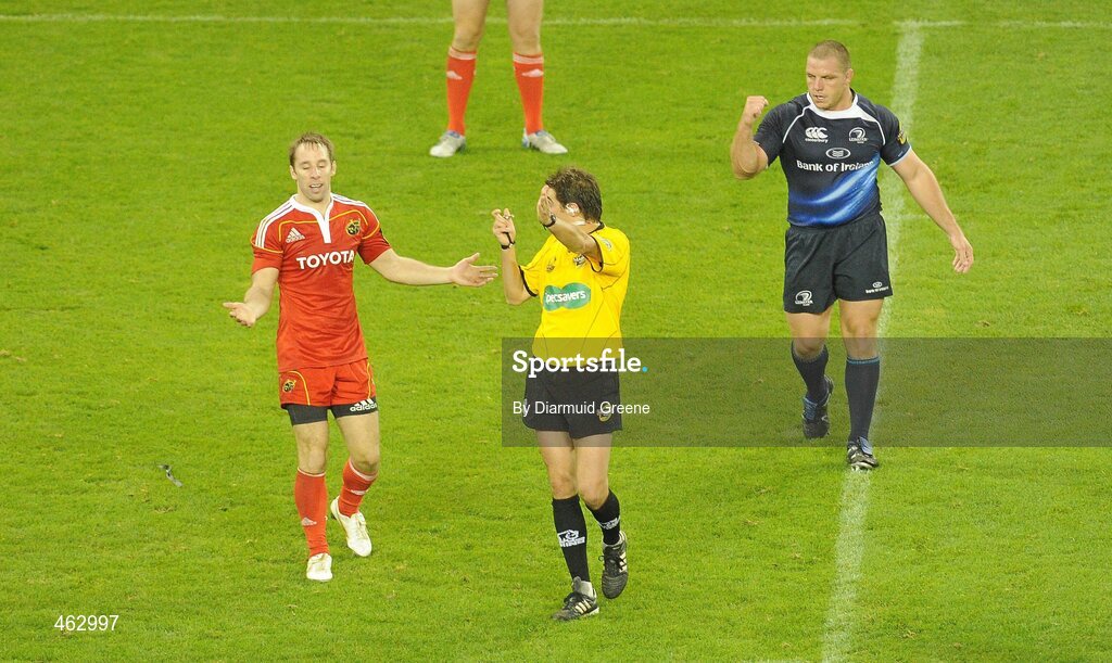 2 October 2010; Munster's Tomas O'Leary, left, reacts as Leinster's Heinke van der Merwe celebrates after referee Jerome Garces blew the final whistle. Celtic League, Leinster v Munster, Aviva Stadium, Lansdowne Road, Dublin. Picture credit: Diarmuid Greene / SPORTSFILE