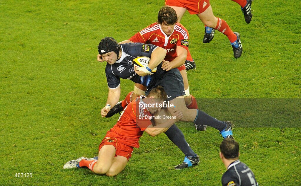 2 October 2010; Mike Ross, Leinster, is tackled by Ronan O'Gara, left, and Donncha O'Callaghan, Munster. Celtic League, Leinster v Munster, Aviva Stadium, Lansdowne Road, Dublin. Picture credit: Diarmuid Greene / SPORTSFILE