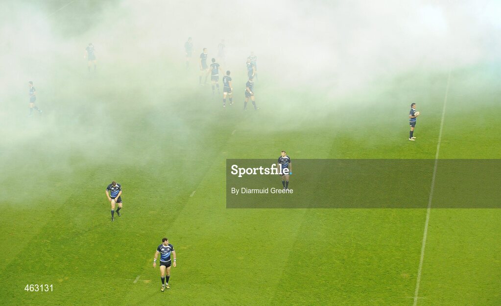 2 October 2010; Leinster's Isa Nacewa, far right, waits for referee Jerome Garces as the start of the game is delayed due to poor visability. Celtic League, Leinster v Munster, Aviva Stadium, Lansdowne Road, Dublin. Picture credit: Diarmuid Greene / SPORTSFILE