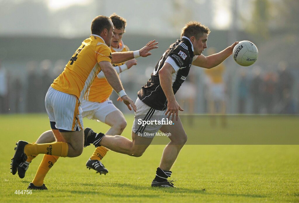 10 October 2010; James Hand, Magheracloone, in action against Martin Corey, Clontibret. Monaghan County Senior Football Championship Final, Clontibret v Magheracloone, Inniskeen, Co. Monaghan. Picture credit: Oliver McVeigh / SPORTSFILE