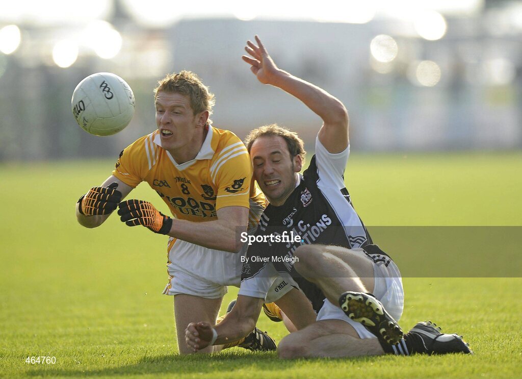 10 October 2010; Anthony Rooney, Clontibret, in action against Francie Doogan, Magheracloone. Monaghan County Senior Football Championship Final, Clontibret v Magheracloone, Inniskeen, Co. Monaghan. Picture credit: Oliver McVeigh / SPORTSFILE