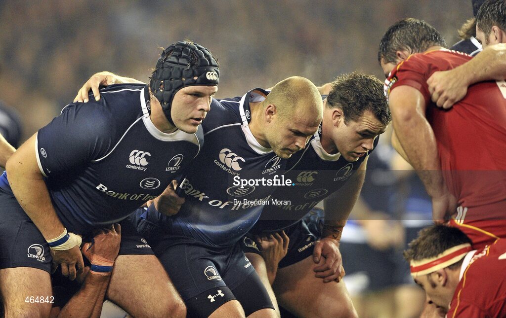 2 October 2010; The Leinster front row, Mike Ross, left, Richardt Strauss and Cian Healy, right. Celtic League, Leinster v Munster, Aviva Stadium, Lansdowne Road, Dublin. Picture credit: Brendan Moran / SPORTSFILE