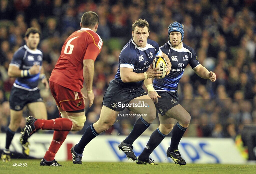 2 October 2010; Cian Healy, Leinster, supported by team-mate Sean O'Brien, in action against Alan Quinlan, Munster. Celtic League, Leinster v Munster, Aviva Stadium, Lansdowne Road, Dublin. Picture credit: Brendan Moran / SPORTSFILE