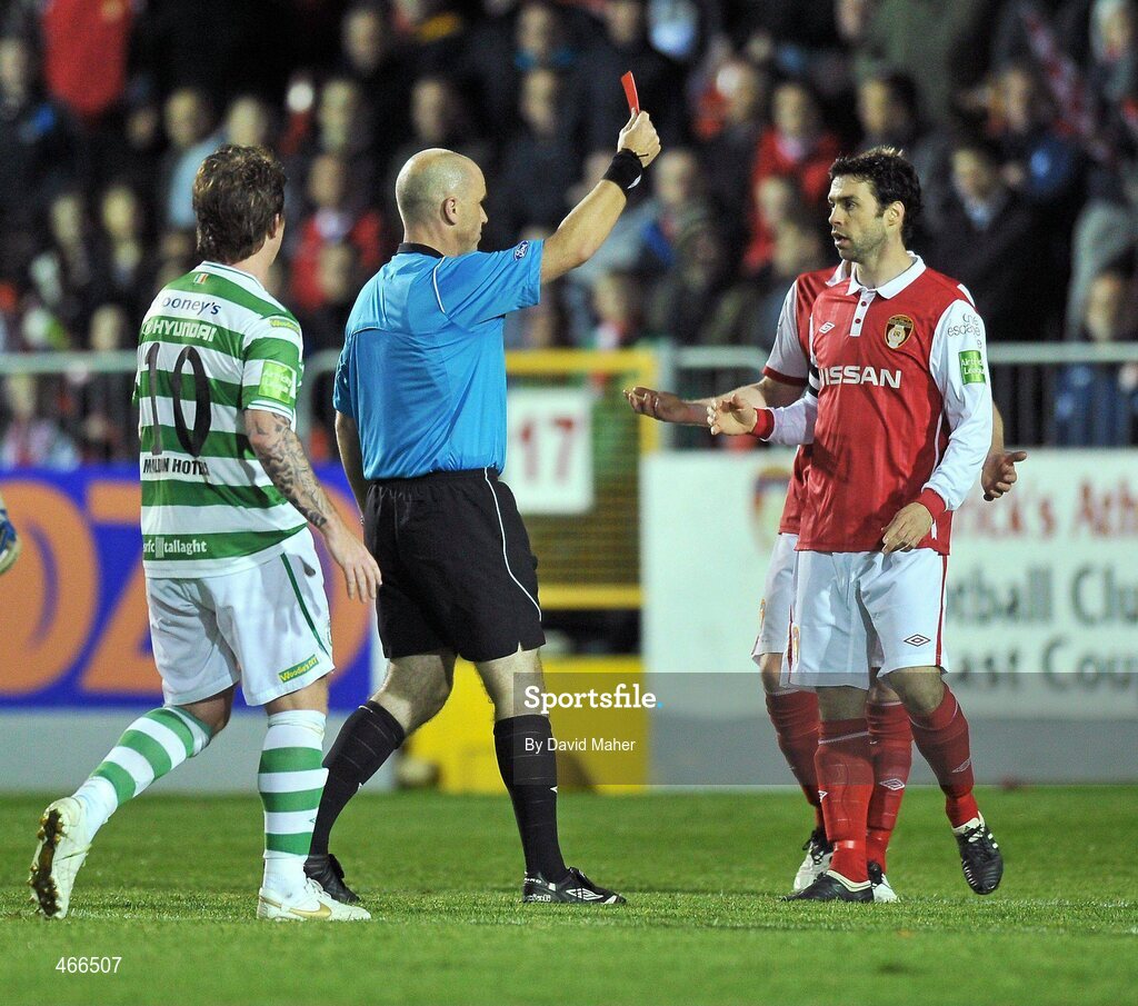 19 October 2010; Referee Tom Connolly sends off Damien Lynch, St Patrick's Athletic. FAI Ford Cup Semi-Final Replay, St Patrick's Athletic v Shamrock Rovers, Richmond Park, Inchicore, Dublin. Picture credit: David Maher / SPORTSFILE
