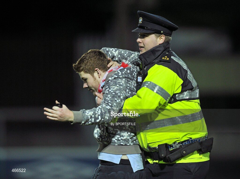 19 October 2010; A supporters is taken away by a member of the Garda Siochana at the end of the game. FAI Ford Cup Semi-Final Replay, St Patrick's Athletic v Shamrock Rovers, Richmond Park, Inchicore, Dublin. Picture credit: SPORTSFILE