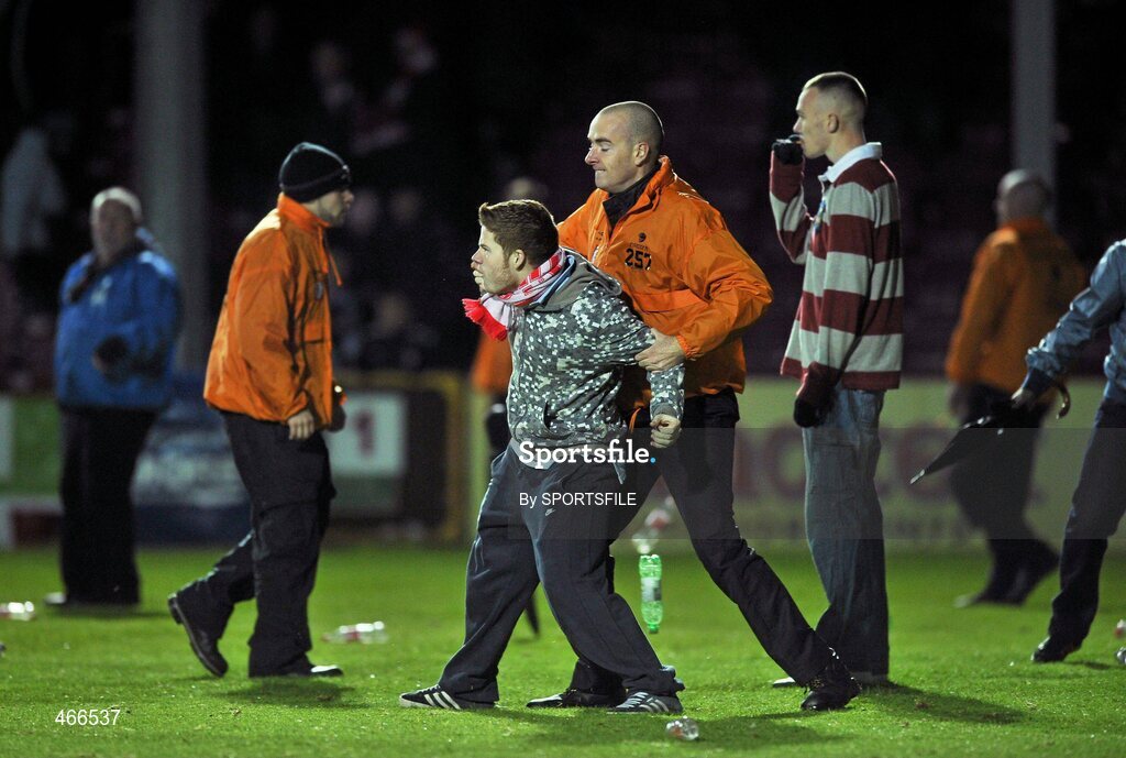 19 October 2010; A supporter is restrained by security staff as supporters clash at the end of the game. FAI Ford Cup Semi-Final Replay, St Patrick's Athletic v Shamrock Rovers, Richmond Park, Inchicore, Dublin. Picture credit: SPORTSFILE