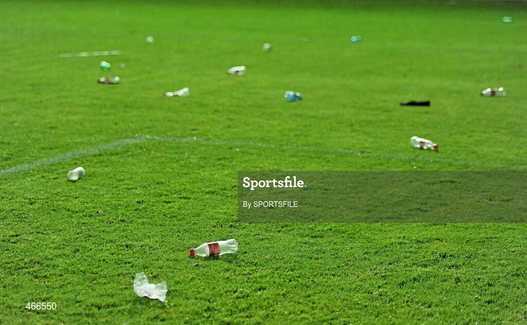 19 October 2010; Bottles on the pitch after supporters clashed with each other at the end of the game. FAI Ford Cup Semi-Final Replay, St Patrick's Athletic v Shamrock Rovers, Richmond Park, Inchicore, Dublin. Picture credit: SPORTSFILE